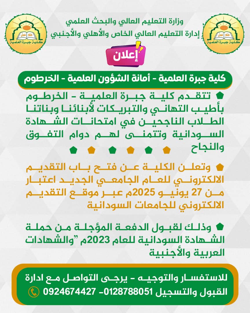 تتقدّم كلية جبرة العلمية – عطبرة بأطيب التهاني والتبريكات لأبنائنا وبناتنا الطلاب الناجحين في امتحانات الشهادة السودانية، وتتمنى لهم دوام التفوق والنجاح.