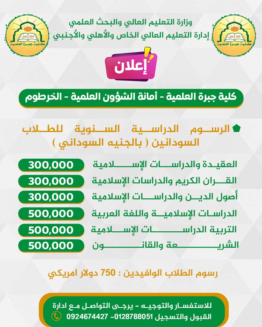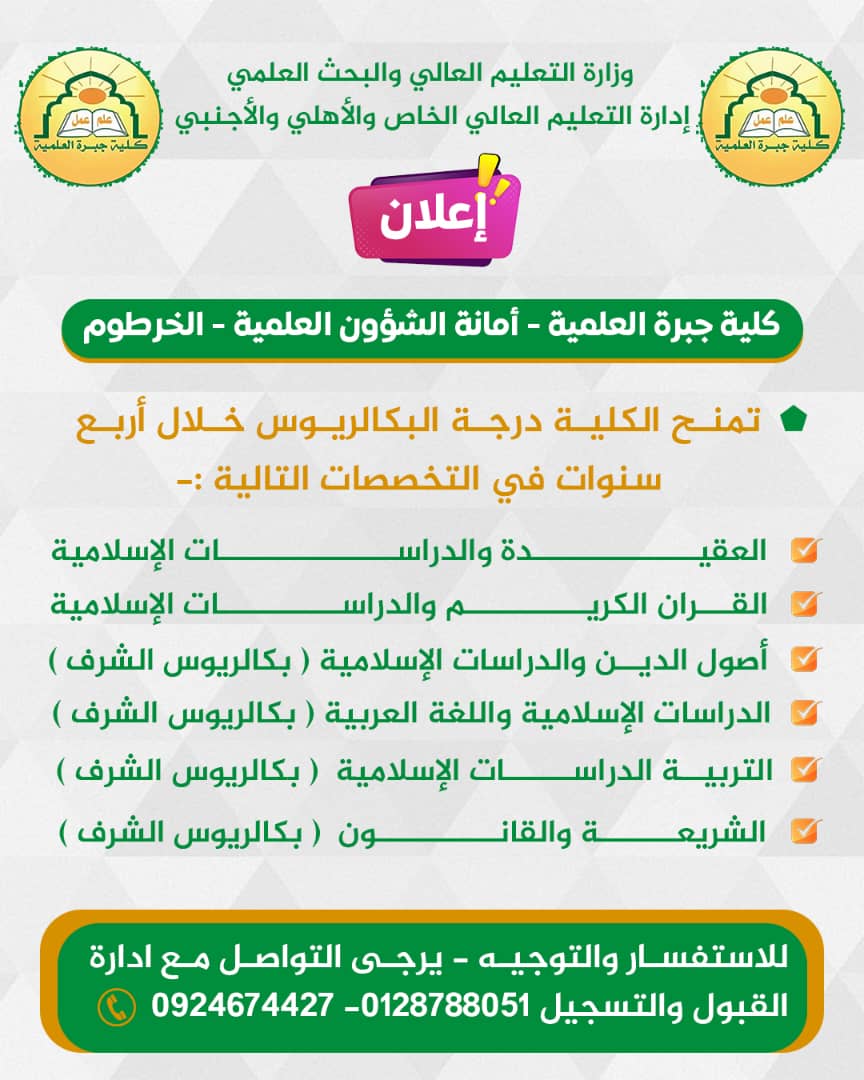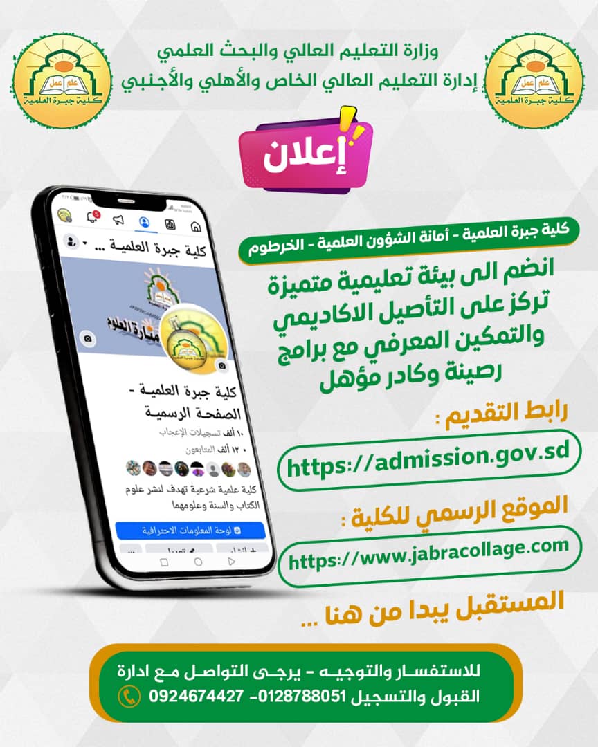 وتُعلن الكلية عن فتح باب التقديم الإلكتروني للعام الجامعي الجديد، ابتداءً من يوم غد الجمعة 27 يونيو 2025م، عبر موقع التقديم الإلكتروني للجامعات السودانية، وذلك لقبول الدفعة المؤجلة من حملة الشهادة السودانية للعام 2023م، والشهادات العربية والأجنبية.