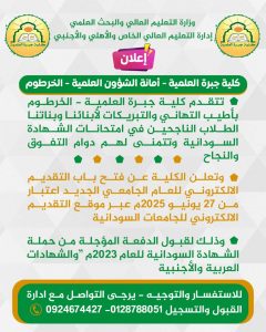 وتُعلن الكلية عن فتح باب التقديم الإلكتروني للعام الجامعي الجديد، ابتداءً من يوم غد الجمعة 27 يونيو 2025م، عبر موقع التقديم الإلكتروني للجامعات السودانية، وذلك لقبول الدفعة المؤجلة من حملة الشهادة السودانية للعام 2023م، والشهادات العربية والأجنبية.